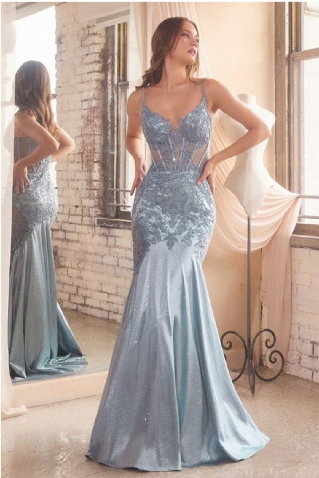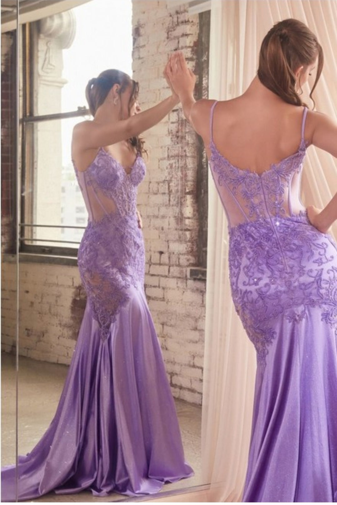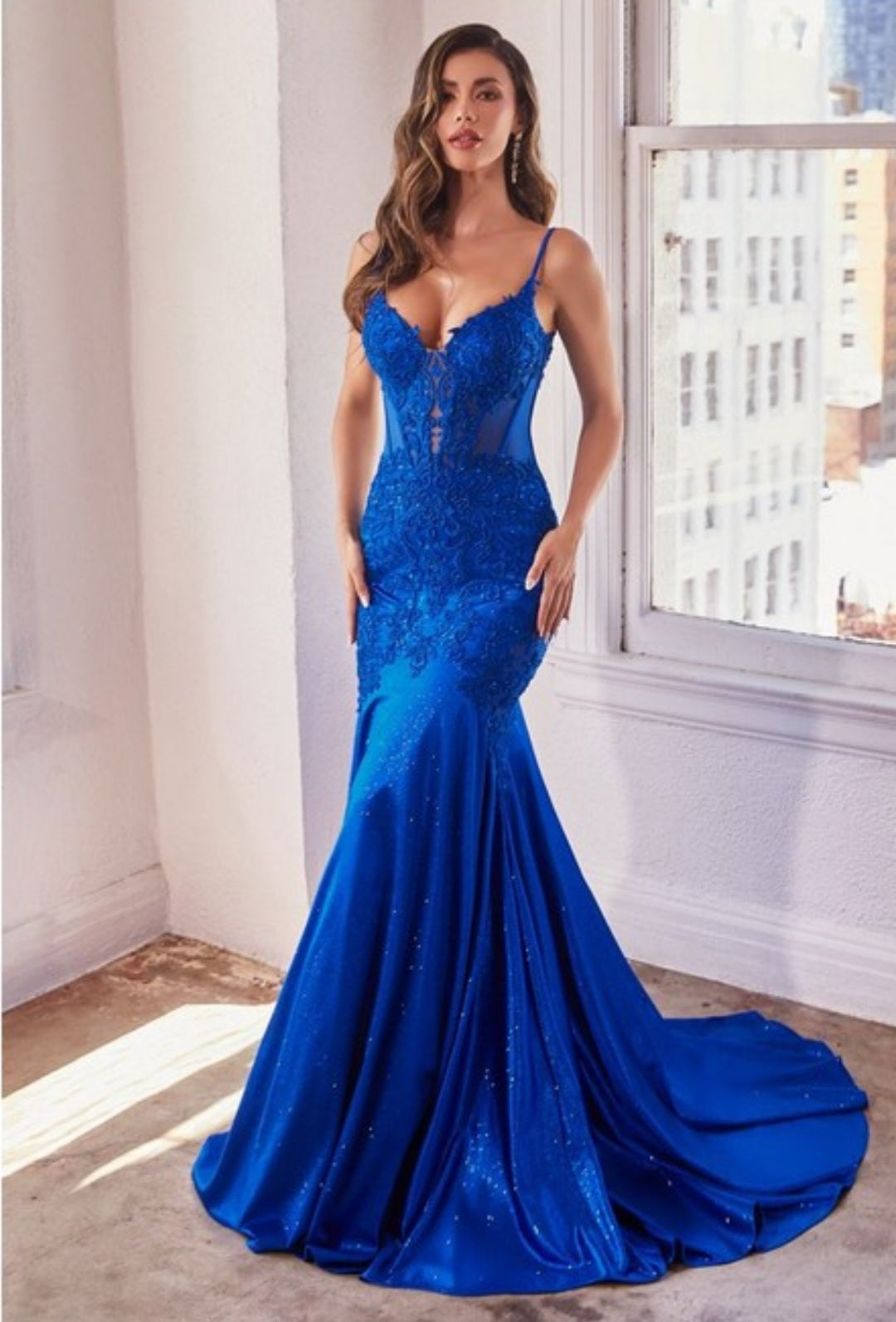 This beautiful mermaid gown features a lace mesh boned corset and a sleeveless design, providing a flattering and elegant look. The boning in the corset adds structure and support, while the lace mesh adds a touch of femininity. Perfect for a formal occasion or special event.