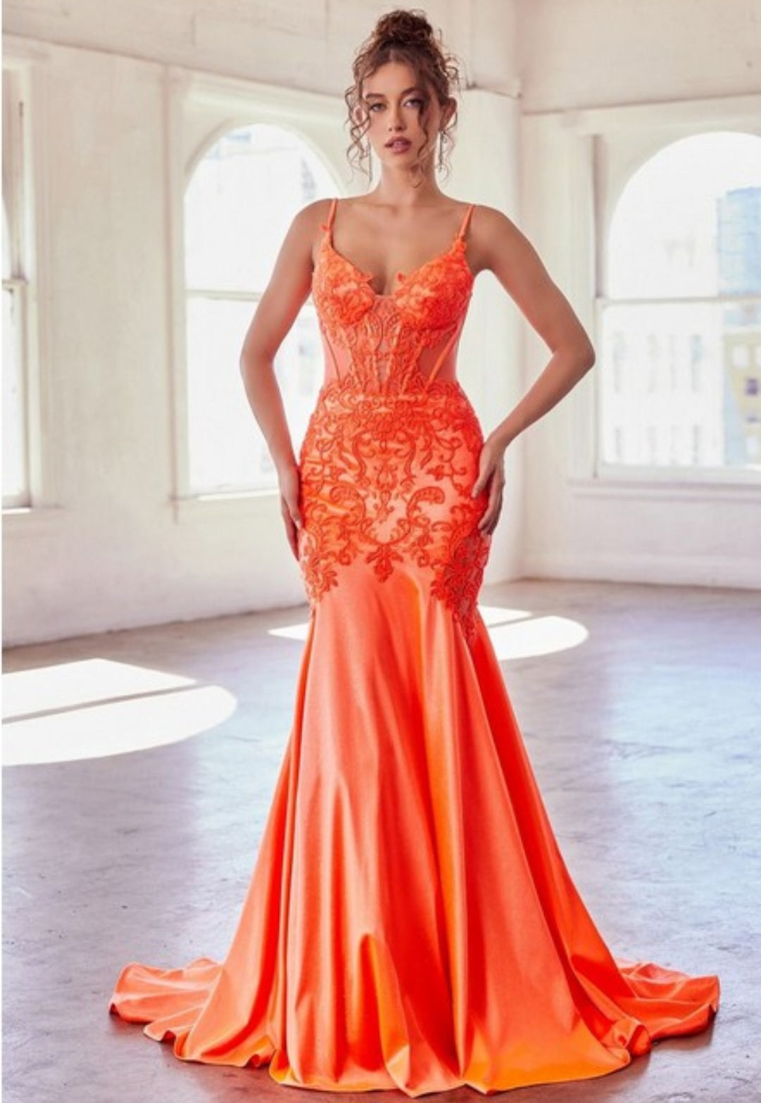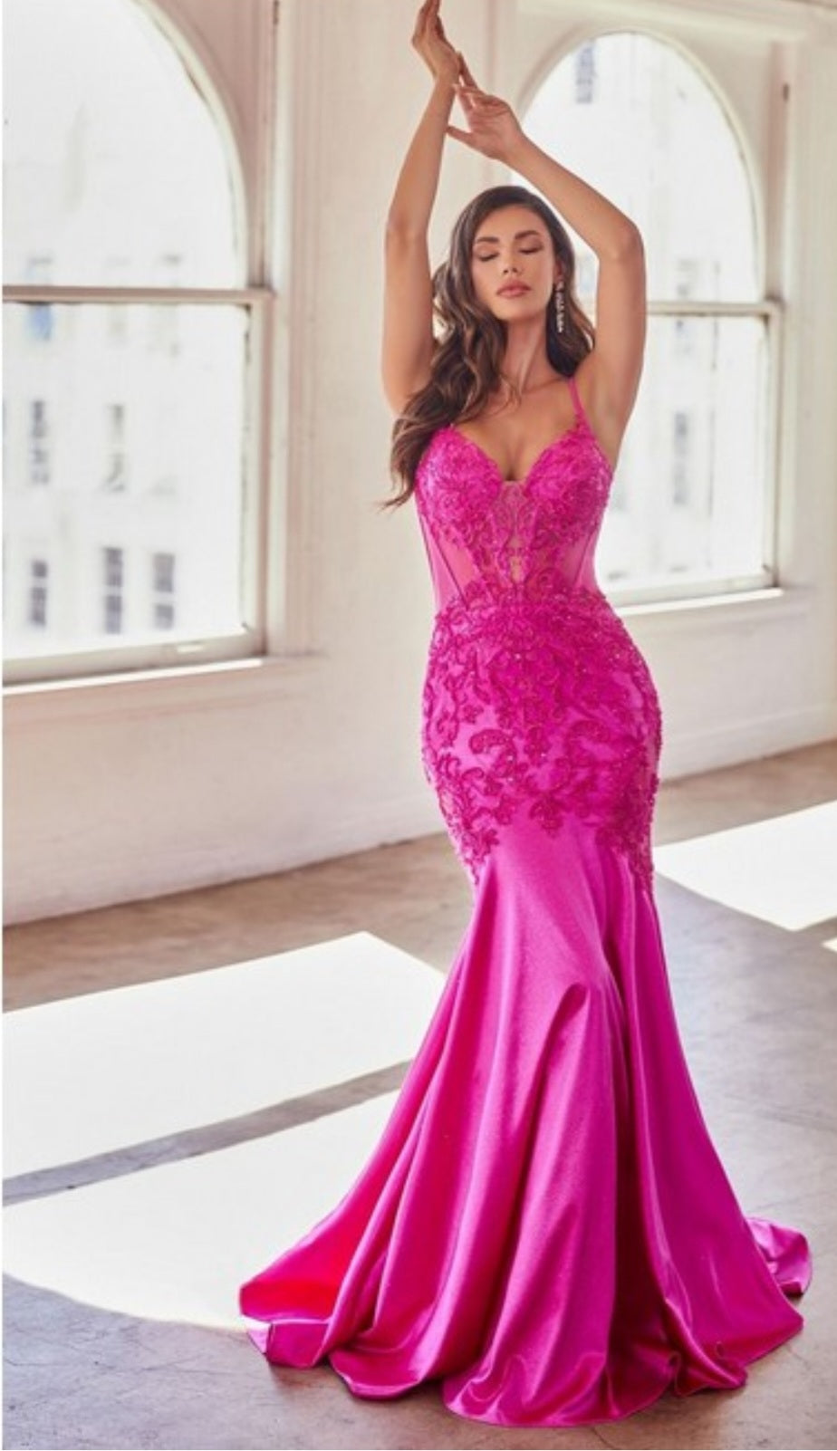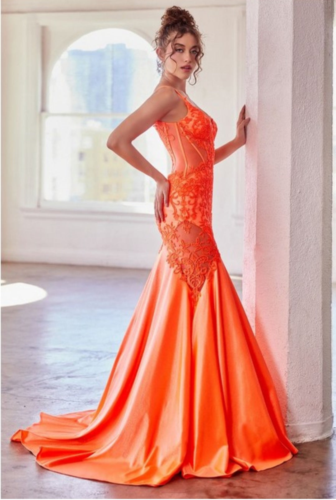 This beautiful mermaid gown features a lace mesh boned corset and a sleeveless design, providing a flattering and elegant look. The boning in the corset adds structure and support, while the lace mesh adds a touch of femininity. Perfect for a formal occasion or special event.