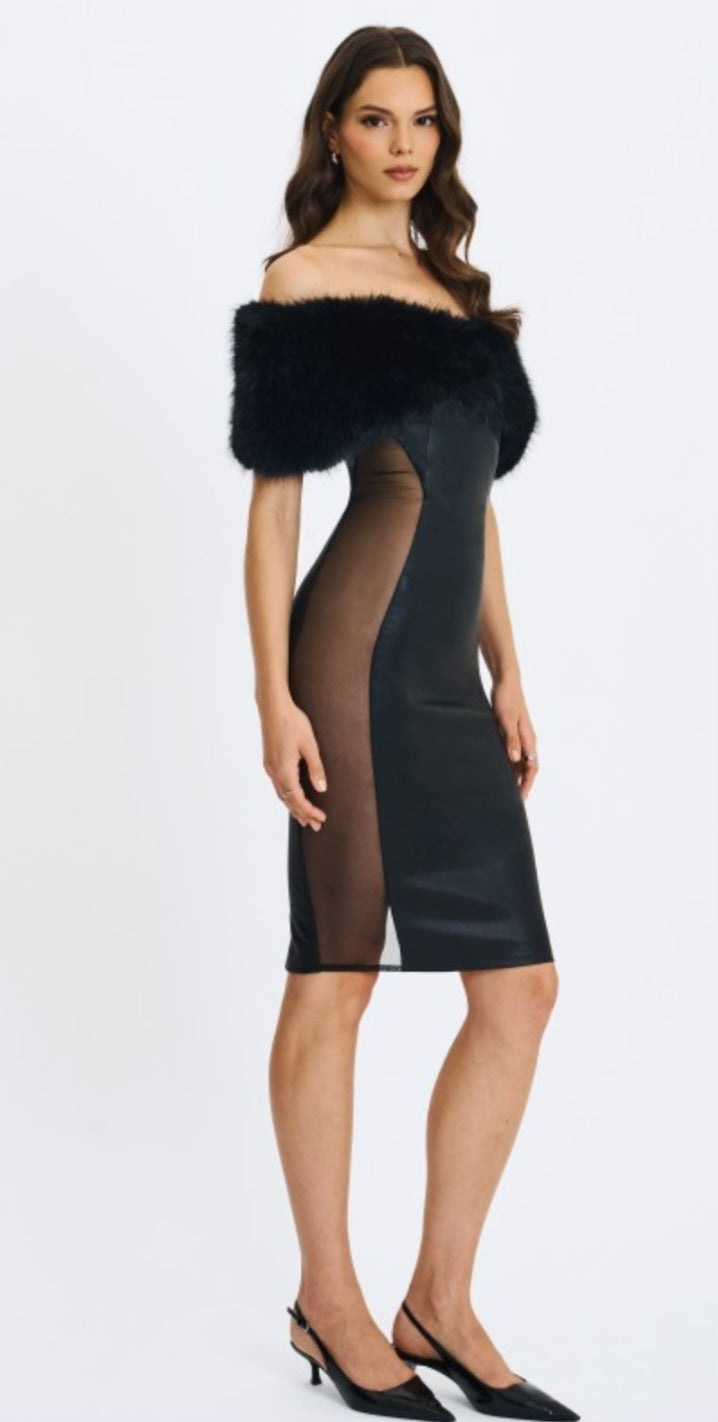 Add some glamour to your wardrobe with our MISS CIRCLE BELLIS FUR TRIMMED MESH OFF THE SHOULDER MIDI DRESS. This bodycon dress is designed to hug your curves and accentuate your figure, making you feel confident and stylish. The fur-trimmed mesh and off-the-shoulder design add a touch of luxury to your look.