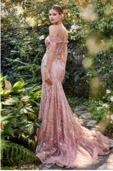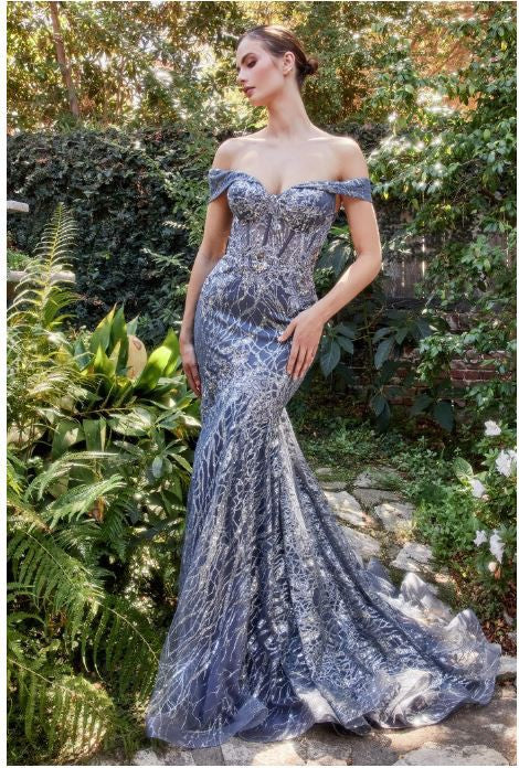 This fitted mermaid off the shoulder gown is both captivating and
